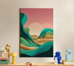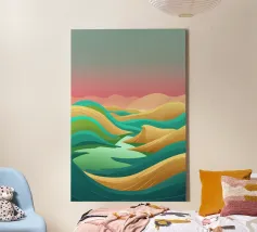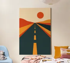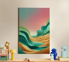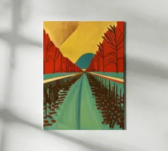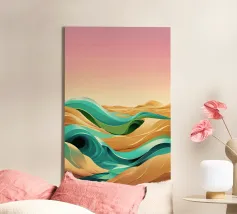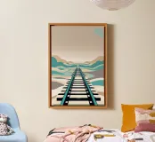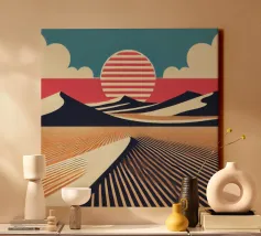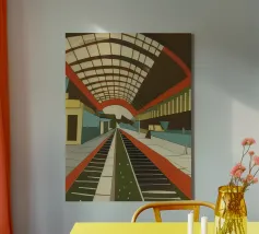 Questa rappresentazione artistica cattura l'iconica linea ferroviaria di Sylt con un approccio minimalista e astratto. La ferrovia si estende all'infinito verso l'orizzonte, fondendosi perfettamente con le morbide dune e le sfumature oceaniche. L'opera enfatizza la transizione senza soluzione di continuità tra le strutture costruite dall'uomo e il paesaggio costiero circostante. I toni tenui del beige, del verde acqua e del marrone sabbioso conferiscono all'immagine una qualità onirica, riecheggiando l'essenza tranquilla e potente del Mare del Nord. La composizione attira lo sguardo lungo i binari, evocando un senso di nostalgia, solitudine e la promessa di un viaggio senza fine.