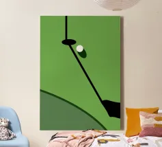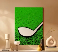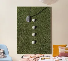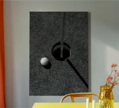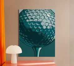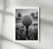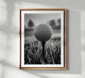 Fotografia in bianco e nero di una pallina da golf su un tee, imperlata di rugiada. Le celle chiare si stagliano su un bokeh di erba scintillante e sagome di alberi sullo sfondo. Luce soffusa dell'alba, un'atmosfera tranquilla prima del drive, una composizione minimalista e sportiva. Un poster elegante e grafico per l'ufficio, il soggiorno, la club house o l'angolo dello sport. Perfetto come wall art per gli appassionati di golf, moderno e contemplativo.