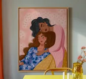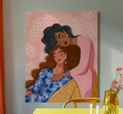 Questa opera d'arte raffigura due persone in un tenero abbraccio, con una persona che appoggia la testa sulla spalla dell'altra. I colori caldi e lo sfondo morbido trasmettono un senso di amore e comfort.