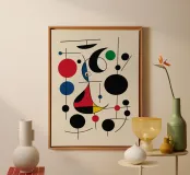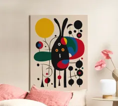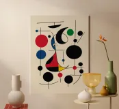 An abstract composition features bold geometric shapes and primary colors, such as red, blue, green, and yellow. The arrangement includes circles, lines, and curves that create a sense of movement and balance.