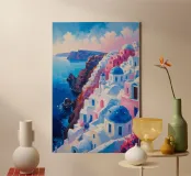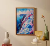 Una rappresentazione luminosa dei tetti a cascata e delle chiese a cupola di Oia, questo dipinto impressionista irradia l'essenza di Santorini. Le cupole blu brillante e le facciate bianche risplendono sotto la luce dell'ora d'oro, mentre le scogliere incorniciano la scena in modo drammatico. L'azzurro del Mar Egeo si estende all'orizzonte, riflettendo la calma serenità dell'isola. I fiori rosa in primo piano aggiungono vivacità, contrastando splendidamente con i tranquilli blu e bianchi. Quest'opera d'arte racchiude il fascino sereno della destinazione più pittoresca della Grecia.