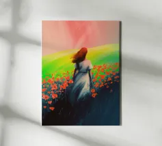 Questa suggestiva composizione in stile impasto presenta uno stretto sentiero grigio che attraversa ampi campi di rosso intenso, con una calda fascia di arancio dorato che lo affianca. Le pennellate pesanti e tattili creano una ricca texture superficiale, enfatizzando la profondità e il movimento. Tre piccole figure che camminano insieme introducono una sottile narrazione umana, suggerendo unità, scelta e direzione condivisa. Gli audaci contrasti cromatici e la composizione verticale trasformano un semplice sentiero in una potente metafora del viaggio e della connessione all'interno di un paesaggio astratto.