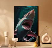Questa splendida opera d'arte cattura l'essenza di un grande squalo bianco che si muove nell'acqua con una grazia senza sforzo e un intento mortale. Le sue fauci spalancate, con denti affilati come rasoi, sono uno spettacolo terrificante e ipnotico. I giochi di luce attraverso la superficie dell'oceano creano un contrasto dinamico, accentuando la forma slanciata dello squalo. I dettagli della pelle, delle cicatrici e delle branchie ne evidenziano la potenza e la resistenza. Questa immagine ritrae magistralmente uno dei predatori più efficienti della natura, evocando ammirazione e paura in egual misura.