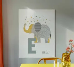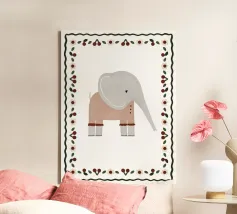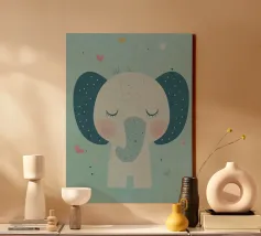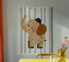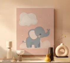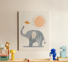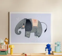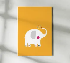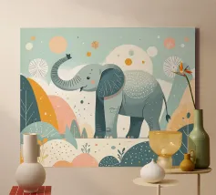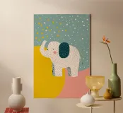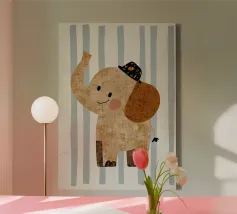 Un'illustrazione stravagante e giocosa di un elefante minimalista che prende vita con texture a puntini e blocchi di colore audaci. Questa affascinante composizione fonde il design moderno e piatto con l'immaginazione infantile, rendendola perfetta sia per l'arredamento della cameretta che per gli interni eleganti ed eclettici. Lasciate che questa gioiosa creatura porti colore e curiosità alla vostra parete.