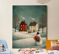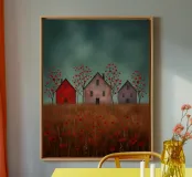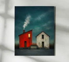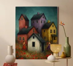 Tre sagome silenziose contro la brezza, immobili sul limite del tempo, con finestre simili a occhi pesanti e chiusi su un campo di papaveri e sospiri. La terra brucia di un rosso antico, mentre il cielo, nel suo verde stanco, riposa sui tetti come un segreto non detto. Nessun passo, nessuna voce, solo l'attesa di coloro che se ne sono andati da tempo, tra alberi spogli con fiori di sangue.