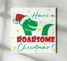 Un allegro dinosauro verde è decorato in modo spiritoso per assomigliare a un albero di Natale, con tanto di luci colorate e stella sulla testa. Le parole "Tree Rex" sono scritte in modo scherzoso accanto ad esso, per rendere ancora più festoso il tema.