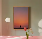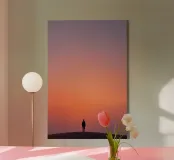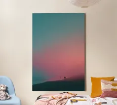 In questa composizione minimalista, una figura solitaria si trova sulla cima di una collina, avvolta da un cielo morbido e sfumato che passa dall'arancio pesca al crepuscolo viola. La scena evoca un tranquillo momento di contemplazione tra terra e cielo, presenza e assenza. L'uso di un ampio spazio negativo accresce la profondità emotiva, rivolgendo lo sguardo dell'osservatore verso l'interno. Uno studio sulla semplicità e sull'umore, quest'opera riflette la silenziosa poesia dell'essere.