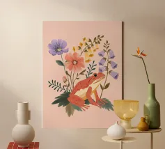 Un uccello dai colori vivaci appollaiato su un ramo accanto a un grande fiore rosa. Lo sfondo è pieno di fogliame e forme astratte.