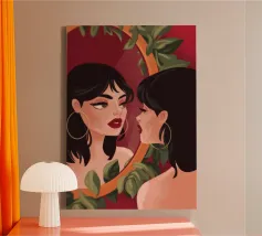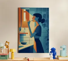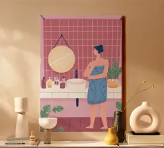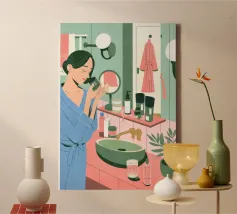 Quest'opera d'arte mostra una persona con i capelli biondi che si guarda allo specchio della vanità. Lo sfondo è riempito da una carta da parati floreale e il tavolo del vanity è adornato con vari oggetti, creando una scena nostalgica e intima.