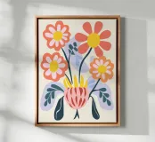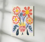 Un vivace e moderno motivo floreale dal sapore retrò: nuclei di fiori giallo brillante, circondati da calde tonalità arancioni e delicati colori pastello, si uniscono per formare un bouquet armonioso in un vaso stilizzato. Completato da sottili sfumature di blu e verde, il risultato è un look unico e senza tempo che illumina qualsiasi ambiente. Perfetto per opere d'arte da parete, tazze, cuscini e accessori per la casa, ideale per gli amanti dell'arredamento di metà secolo, dell'estetica boho e dei design floreali. Un'ispirazione per il soggiorno, la camera da letto o l'ufficio e un regalo affascinante per gli amanti dell'arte e dei fiori.