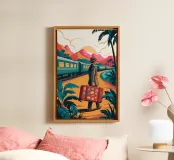 L'opera raffigura una persona in piedi vicino a un treno con una valigia, sullo sfondo di montagne e palme. La scena evoca un senso di nostalgia e avventura.