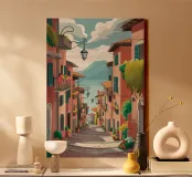 Una veduta prospettica di una strada europea stretta e tortuosa, fiancheggiata da edifici colorati, piante in vaso e diretta verso un cielo luminoso e nuvoloso.