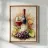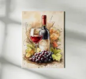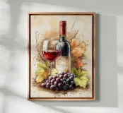 Un'elegante illustrazione che raffigura una bottiglia di vino rosso con un bicchiere abbinato, circondata da grappoli d'uva e foglie autunnali. Perfetto come decorazione murale in cucina o in una cantina, questo poster aggiunge un'atmosfera raffinata e stagionale.