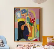 Un ritratto astratto o una rappresentazione di figure di chiara influenza cubista, con volti e forme frammentate in una vibrante tavolozza di gialli, rosa, blu, verdi e neri.