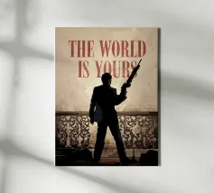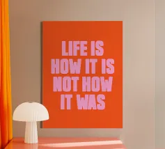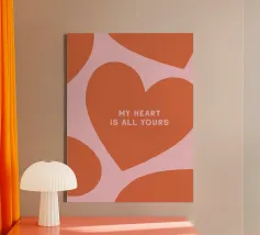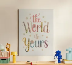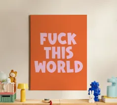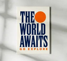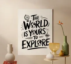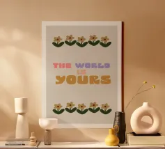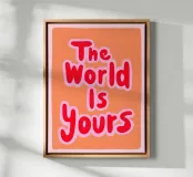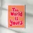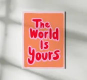 "Il mondo è tuo!" - Un avventuroso motivo estivo nelle vivaci tonalità del rosa, del rosso e dell'arancione. Questo disegno tipografico ispira viaggi ed esplorazioni, mentre il carattere audace incarna libertà e possibilità.