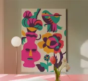 Una composizione astratta con un volto rosa con gli occhi chiusi, circondato da fiori e uccelli colorati. Gli elementi sono disposti in modo stravagante e surreale.