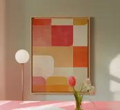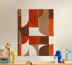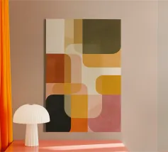 Questa composizione astratta esplora l'armonia attraverso la sovrapposizione di forme geometriche e una tavolozza calda di ispirazione vintage. I rettangoli arrotondati si intersecano dolcemente, creando trasparenze stratificate che suggeriscono movimento e profondità senza una struttura rigida. I toni della terracotta, del corallo, dell'ocra, del crema tenue e dell'oro tenue evocano il design moderno della metà del secolo scorso, pur rimanendo freschi e contemporanei. La sottile texture superficiale aggiunge una qualità tattile, bilanciando precisione e calore. L'opera d'arte riflette un ritmo e un equilibrio tranquilli, rendendola un pezzo raffinato per interni moderni, minimalisti o di ispirazione rétro.