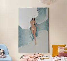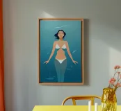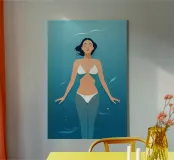 A woman floating effortlessly in clear water, her form blending with the ocean’s calm. This minimalist piece captures freedom, stillness, and connection with nature.