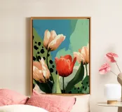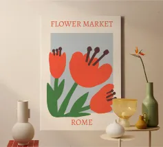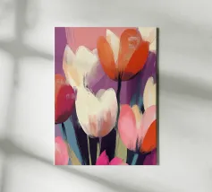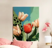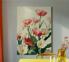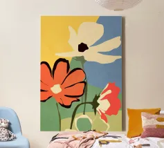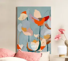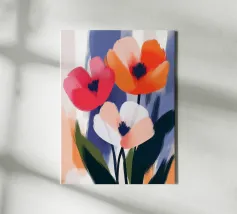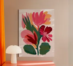 Una composizione floreale espressiva in cui colore ed emozione si dispiegano insieme. Morbidi fiori color pesca e rosso intenso si stagliano su sfondi verdi e tonalità celesti, catturando la sensazione di qualcosa che sta delicatamente iniziando. Quest'opera d'arte riflette l'amore, la speranza e la connessione nella loro forma più primitiva, ideale per interni che abbracciano calore, ottimismo e profondità emotiva.
