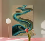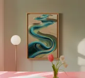 L'immagine rappresenta astrattamente il viaggio del fiume Eufrate attraverso il paesaggio siriano. Le sue acque turchesi tagliano le sabbie dorate del deserto, sottolineando il ruolo essenziale del fiume nel sostenere la vita in questa regione. L'opera fonde la geografia naturale con una visione creativa, catturando l'intricata danza dell'acqua e della terra. Le curve del fiume simboleggiano la resilienza e la bellezza di fronte alle sfide della natura, rendendo omaggio a uno dei corsi d'acqua più antichi del mondo.