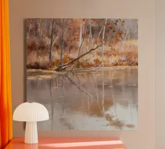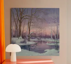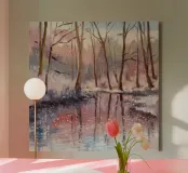 Alberi spogli e cielo rosa si riflettono dolcemente in uno stagno invernale in fase di disgelo, evocando una serena e fredda bellezza.