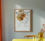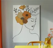 Un disegno al tratto minimalista raffigura il profilo di una donna dall'espressione serena. I suoi capelli sono ornati da grandi fiori stilizzati di colore arancione e giallo e da foglie delicate.