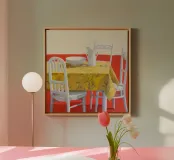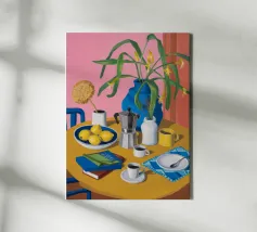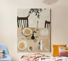 Una semplice e classica natura morta di un tavolo da pranzo con una tovaglia gialla, apparecchiato con un piatto e una brocca. La composizione è una rappresentazione serena, minimalista e meravigliosamente sobria di un pasto in attesa.