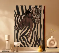 Aggiungi un tocco di eleganza unica alla tua decorazione con questa canvas che ritrae il profilo di una figura avvolta in strisce di zebra. Perfetto per ambienti contemporanei, questa opera è ideale per il soggiorno o la camera da letto e trasmette un'atmosfera artistica.