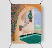 Un'illustrazione tropicale in un ambiente mediterraneo. La panchina invita a sognare in questo ambiente estivo.