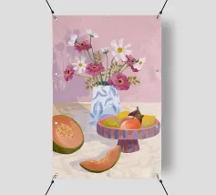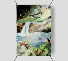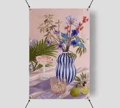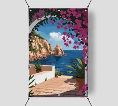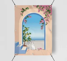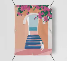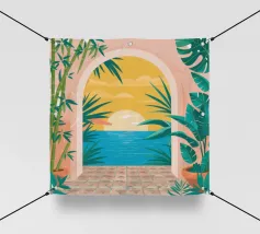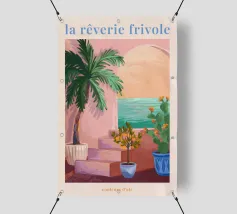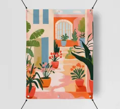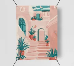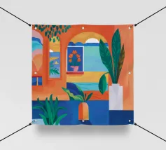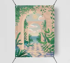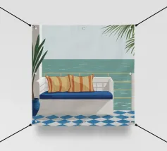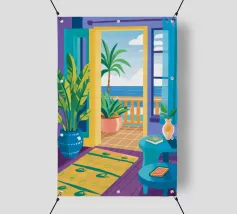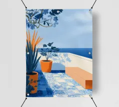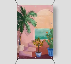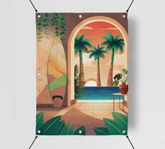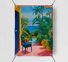 Un'illustrazione tropicale in un ambiente mediterraneo. La panchina invita a sognare in questo ambiente estivo.