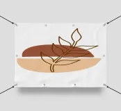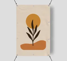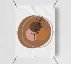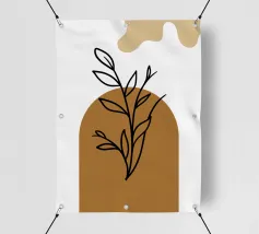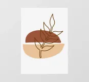 Una composizione astratta presenta un semplice sfondo geometrico marrone e beige con un delicato disegno al tratto di un ramoscello frondoso. Il design minimalista enfatizza gli elementi naturali in un equilibrio armonioso.