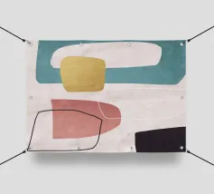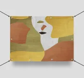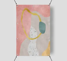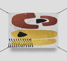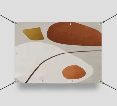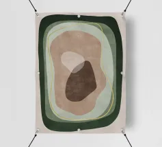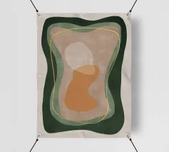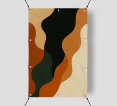 Forme astratte in tonalità terrose creano una composizione armoniosa con forme fluide e contrasti decisi. Curve organiche e macchie di ocra, marrone e oliva costituiscono il motivo centrale.
