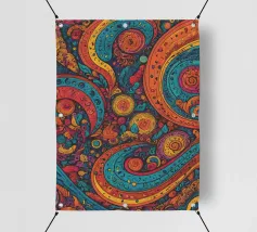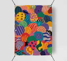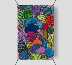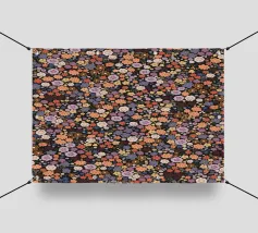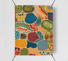 Un ricco motivo astratto con forme organiche e superfici strutturate in colori caldi come verde acqua, rosso ruggine, giallo oro, corallo, beige e blu su sfondo nero. Perfetto per gli amanti dell'arte astratta, gli appassionati di texture, i fan dei colori caldi e tutti coloro che apprezzano le forme organiche con dettagli artistici e la raffinatezza della terra.