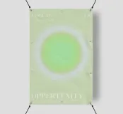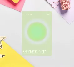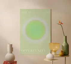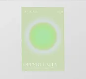 L'immagine è un poster dal design minimalista. Lo sfondo è verde chiaro e presenta un cerchio sfocato al centro con una morbida sfumatura di colore che passa dal verde al bianco, creando un effetto luminoso. Nella parte superiore del poster è presente il testo: "ANGEL NO. 000". In basso, "OPPORTUNITY" è scritto in grandi lettere bianche e in grassetto. Sotto "OPPORTUNITÀ" c'è un testo più piccolo che recita: "SI TRATTA DI NUOVI INIZI. NON ABBIATE PAURA DI FARE IL SALTO NELL'IGNOTO, DI ABBRACCIARE IL CAMBIAMENTO E LE OPPORTUNITÀ DEL CAMBIAMENTO".