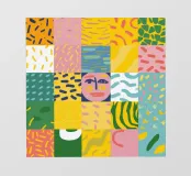 Una composizione astratta vibrante ed energica con un volto stilizzato integrato in un patchwork colorato di motivi geometrici. L'opera è un'esplorazione moderna e giocosa dell'identità e della forma.