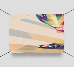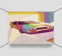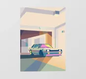 Illustrazione di un'auto in un garage con uno stile geometrico moderno. Perfetta per poster, decorazioni di ambienti o materiale promozionale a tema automobilistico e domestico.