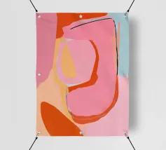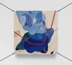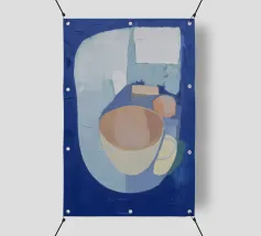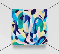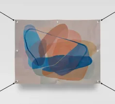 Un dipinto astratto dinamico, caratterizzato da forme fluide e sovrapposte in una suggestiva combinazione di blu, arancione caldo e beige neutro, che trasmette un'energia fluida.