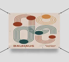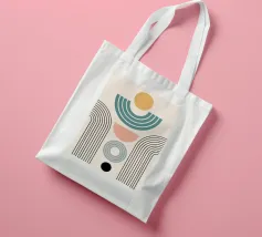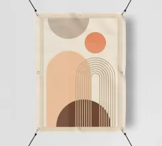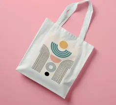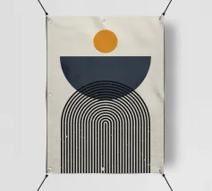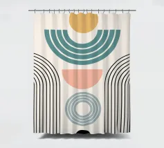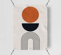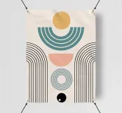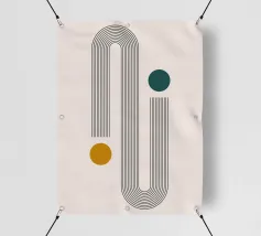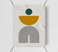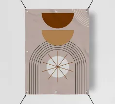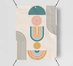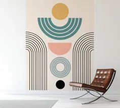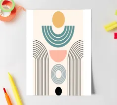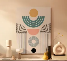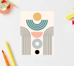 Le forme geometriche sono disposte in una composizione equilibrata con cerchi, archi e semicerchi in tonalità tenui. Il design è caratterizzato da un gioco di linee e forme che creano un senso di simmetria e armonia.