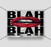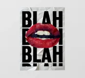 "Un paio di labbra rosse, lucide e vibranti, posizionate tra le parole 'BLAH' impilate verticalmente in una tipografia nera e audace su uno sfondo bianco e pulito, creano una dichiarazione giocosa e sprezzante. Il contrasto tra le labbra realistiche e il testo grafico aggiunge un tocco pop art.",