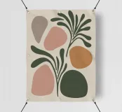 Una miscela armoniosa di natura e astrazione moderna, questo disegno presenta una foglia delicata completata da forme morbide e organiche in una tavolozza di colori pastello. Perfetto per aggiungere un tocco di tranquillità ed eleganza a qualsiasi spazio, questo pezzo di ispirazione boho incarna semplicità ed equilibrio.