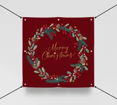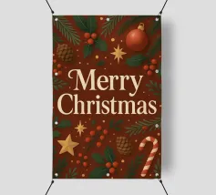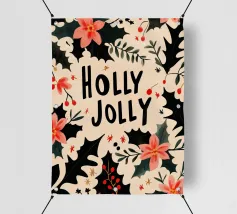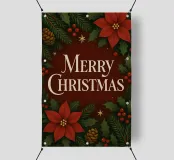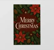 Una calda ed elegante illustrazione natalizia con vibranti stelle di Natale, rami di pino, bacche e stelle dorate che circondano un messaggio senza tempo di "Buon Natale". I ricchi rossi e i verdi intensi creano un'atmosfera classica e festosa, perfetta per interni accoglienti, angoli regalo e decorazioni stagionali.