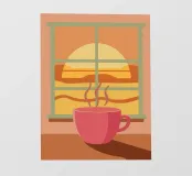 Un'illustrazione semplice e confortante di una tazza rosa di caffè o tè fumante, appoggiata a una finestra con vista sul sole che sorge. La scena cattura perfettamente il calore e la speranza di un nuovo mattino.