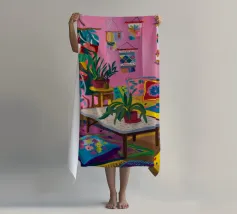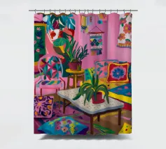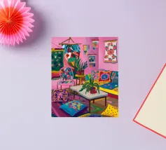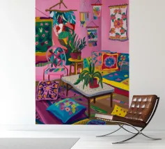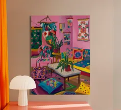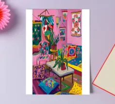 Un soggiorno bohémien è caratterizzato da rosa, viola e cuscini a fantasia che creano un'atmosfera calda e accogliente.