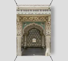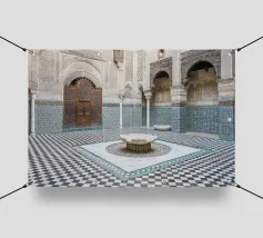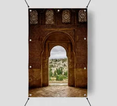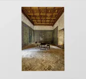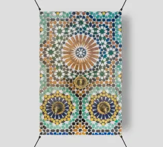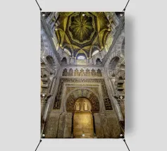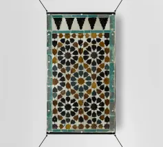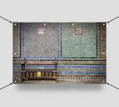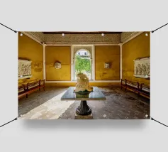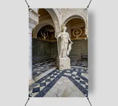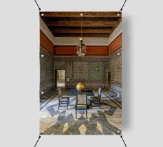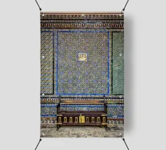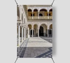 L'immagine mostra un interno storico della Casa de Pilatos di Siviglia, un palazzo del XVI secolo con influenze architettoniche mudéjar, gotiche e rinascimentali. Le pareti sono completamente ricoperte da piastrelle decorate con motivi geometrici e floreali nei toni del blu, del verde e del marrone. Queste piastrelle sono tipiche dell'arte mudéjar e riflettono la diversità culturale dell'Andalusia. Il soffitto è costituito da pannelli in legno dorato con complessi ornamenti e rilievi che documentano la maestria dell'epoca.