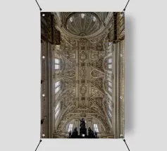 L'immagine mostra un interno storico della Casa de Pilatos di Siviglia, un palazzo del XVI secolo con influenze architettoniche mudéjar, gotiche e rinascimentali. Le pareti sono completamente ricoperte da piastrelle decorate con motivi geometrici e floreali nei toni del blu, del verde e del marrone. Queste piastrelle sono tipiche dell'arte mudéjar e riflettono la diversità culturale dell'Andalusia. Il soffitto è costituito da pannelli in legno dorato con complessi ornamenti e rilievi che documentano la maestria dell'epoca.