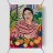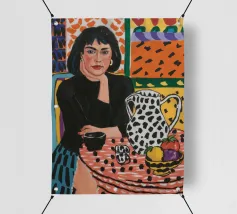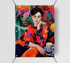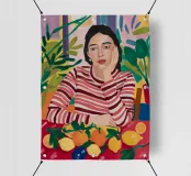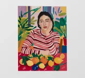 Ritratto di una persona con una camicia a righe bianche e rosse, che appoggia il mento sulla mano dietro un tavolo pieno di agrumi. Lo sfondo è costituito da un rigoglioso disegno di foglie verdi, che crea uno stato d'animo calmo e introspettivo.