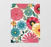 Un campo denso e gioioso di vari fiori stilizzati in una caleidoscopica gamma di colori vivaci. L'illustrazione è una celebrazione della diversità e della bellezza della natura, resa in uno stile grafico e allegro.