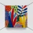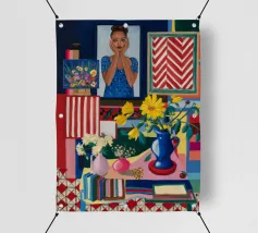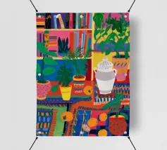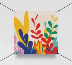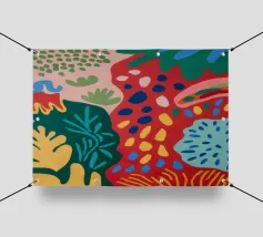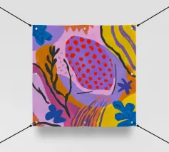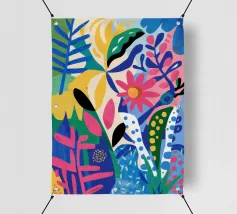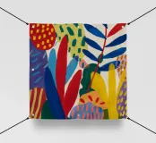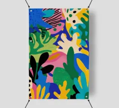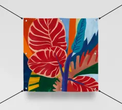 Una composizione dinamica e astratta di forme verticali, che combina foglie stilizzate e forme audaci in una ricca tavolozza di rosso, blu, viola e giallo, creando un senso di energia verso l'alto.