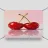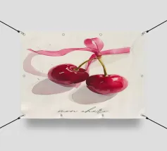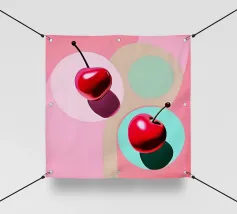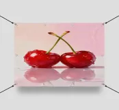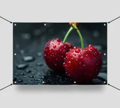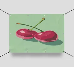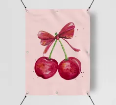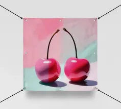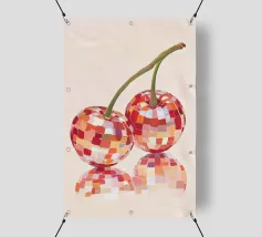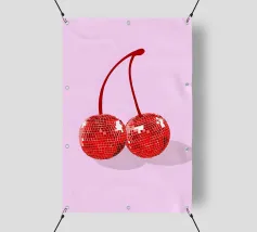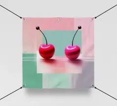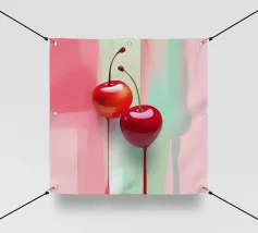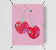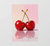Due ciliegie lucide con gocce d'acqua e uno sfondo rosa tenue creano un'atmosfera pop-art dolce e moderna.