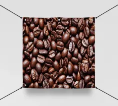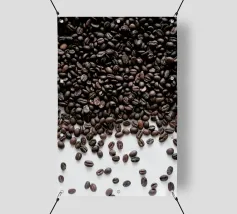 I chicchi di caffè marrone sono sospesi in aria sopra una superficie lucida che riflette una pozza scura di caffè preparato, creando un'atmosfera drammatica e accattivante.